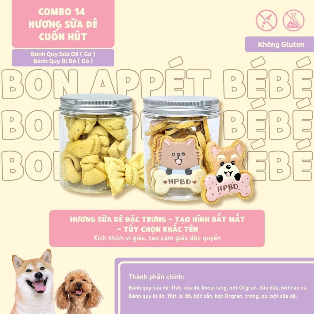 Combo 14 kết hợp hương sữa dê béo ngậy và vị bí đỏ dịu nhẹ — tạo thành cặp bánh vừa thơm, vừa xinh, phù hợp làm phần thưởng, bữa phụ hoặc quà tặng cao cấp