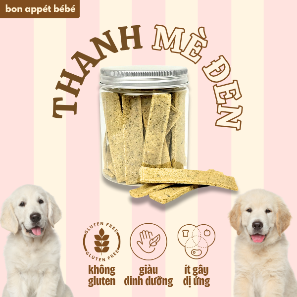 Thanh Mè Đen Không Gluten là dòng bánh thưởng thủ công, không chứa gluten, không chất bảo quản và không phụ gia công nghiệp – đặc biệt phù hợp với cún nhạy cảm hoặc đang tập làm quen với các loại bánh.